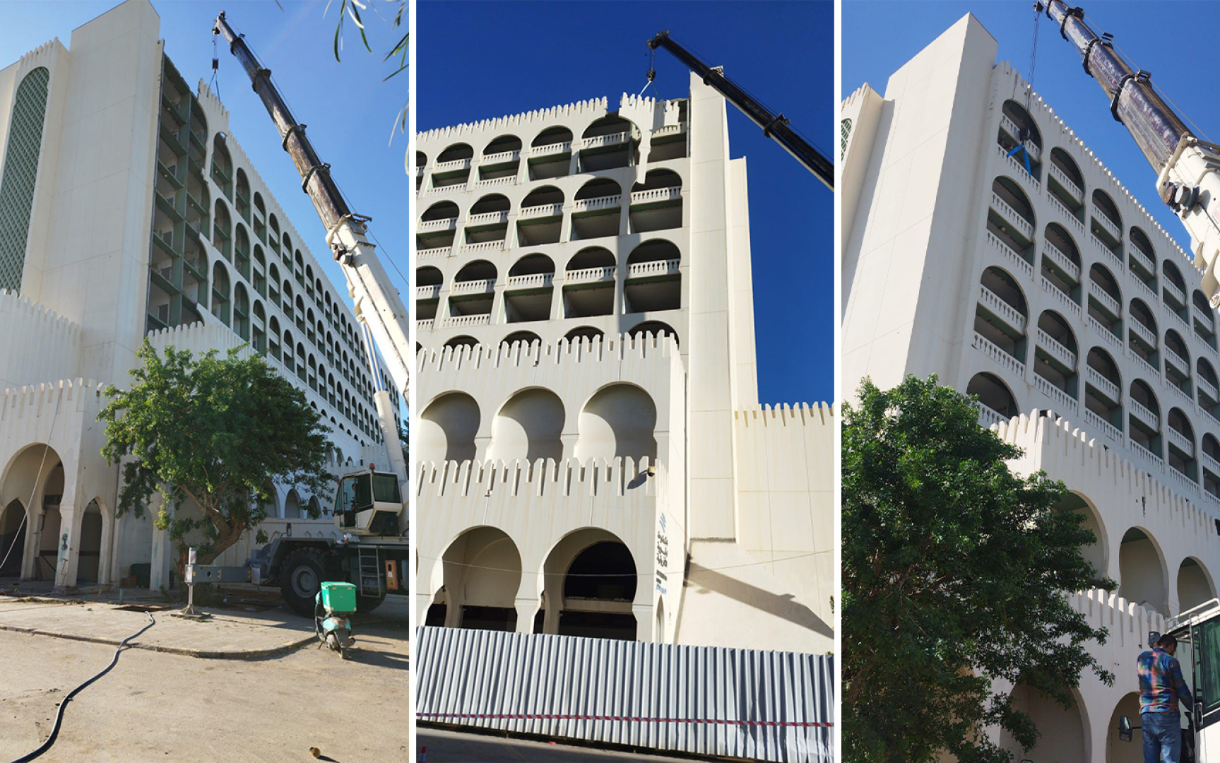 Libya’da gerçekleştirilen otel yenileme projesi kapsamında; eski cephe söküm işleri ile birlikte, yeni cephe tasarımına uygun yerinde üretim ve uygulama çalışmaları başarıyla tamamlanmıştır.